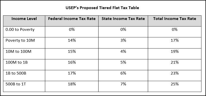 To achieve these goals, the USEP’s tiered-flat income tax would apply a fixed Federal income tax rate to every taxpayer and corporate entity according to their annual earnings level. If States were to adopt a similar structure, income tax levels would be expected to vary from state to state based on the acceptance / rejection of Federal incentive funds, rate negotiations, and debt conciliation between the two levels of government.